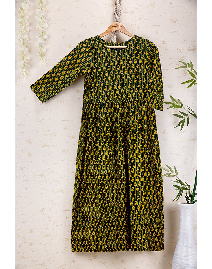 Feel the comfort of this elegantly handprinted knee length yellow kurta made from handwoven cotton fabric.